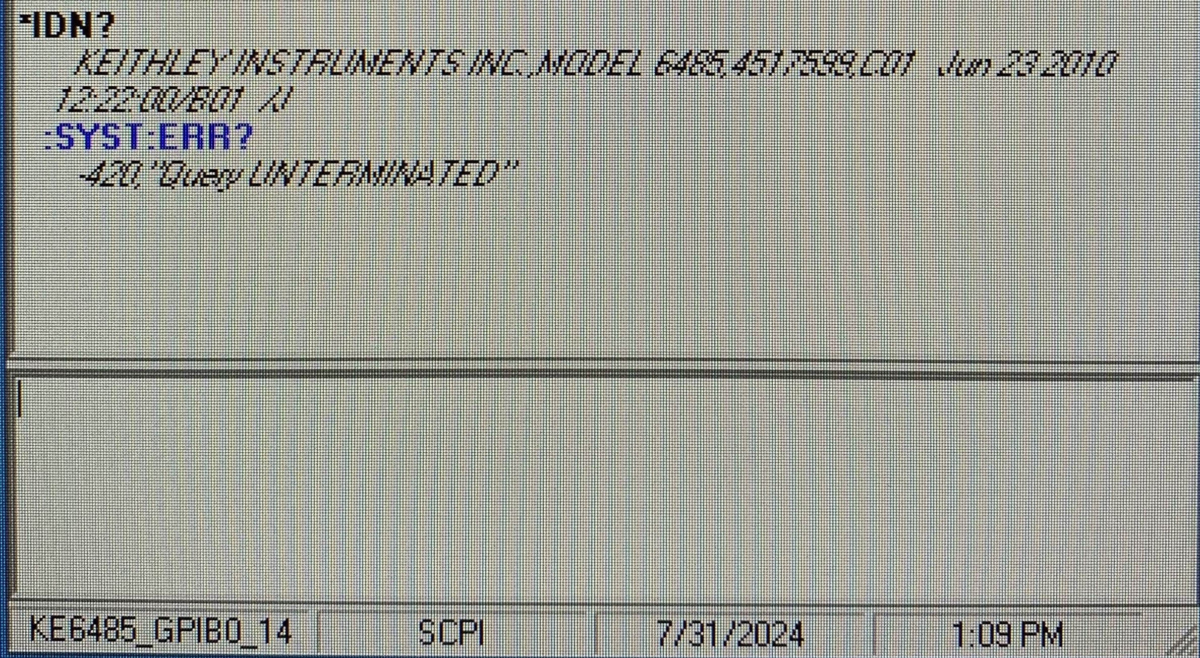 Another weird thing. When I first boot up the picoammeter the front display says "6485 C01" (the manual says C01 would indicate my firmware version), but when I send the command "*IDN?" via the keithley communicator, it says my firmware is B01. So I'm confused, is my firmware C01 or B01?