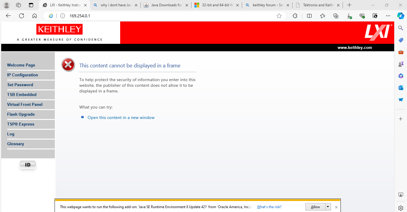 Hi guys, i am completely new to Keithley instruments here and I am currently working on a project. I have successfully connected the 2604B source meter with my ACER computer using LAN cable. By right, it should be able to reflect virtual front panel and TSP express just likw what shown below but....it keeps on saying that this content cannot be displayed in frame ? As for the TSP express, it keeps on prompting me to install JRE but the issue here is I have already downloaded JRE.....I am not sure what went wrong here....any advice ?<br> &#160;